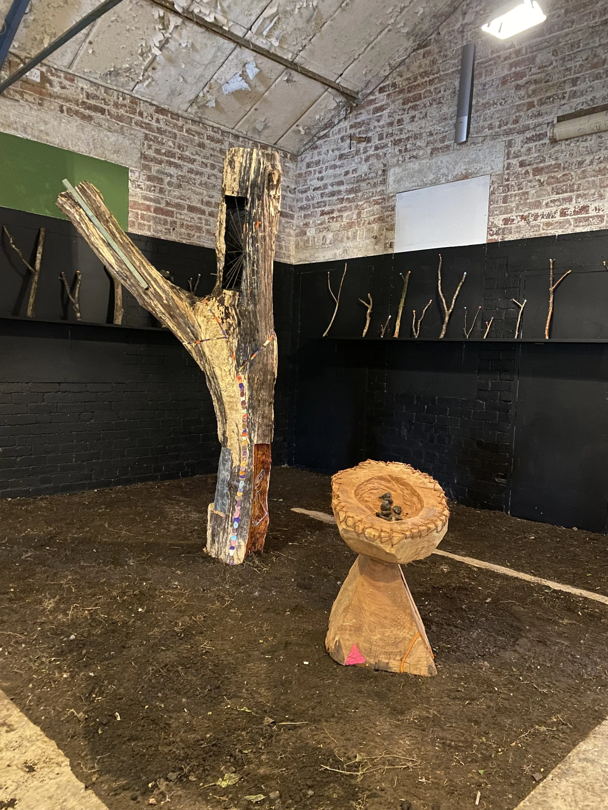 Kainoaʻs work includes a series of Y shaped branches gathered from the woods around the Wireworks. This natural occurrence, where branches and leaves diverge from the main stem, prompts the question "Y?" and offers two possible paths. Two large Ys standing on either side of the space are adorned with various materials including a map etched into lead, woven lauhala suspended in coconut rope, and multicolored joints to stabilize the cracks. These perhaps provide a clue about who is asking the question, or, to where these paths lead.